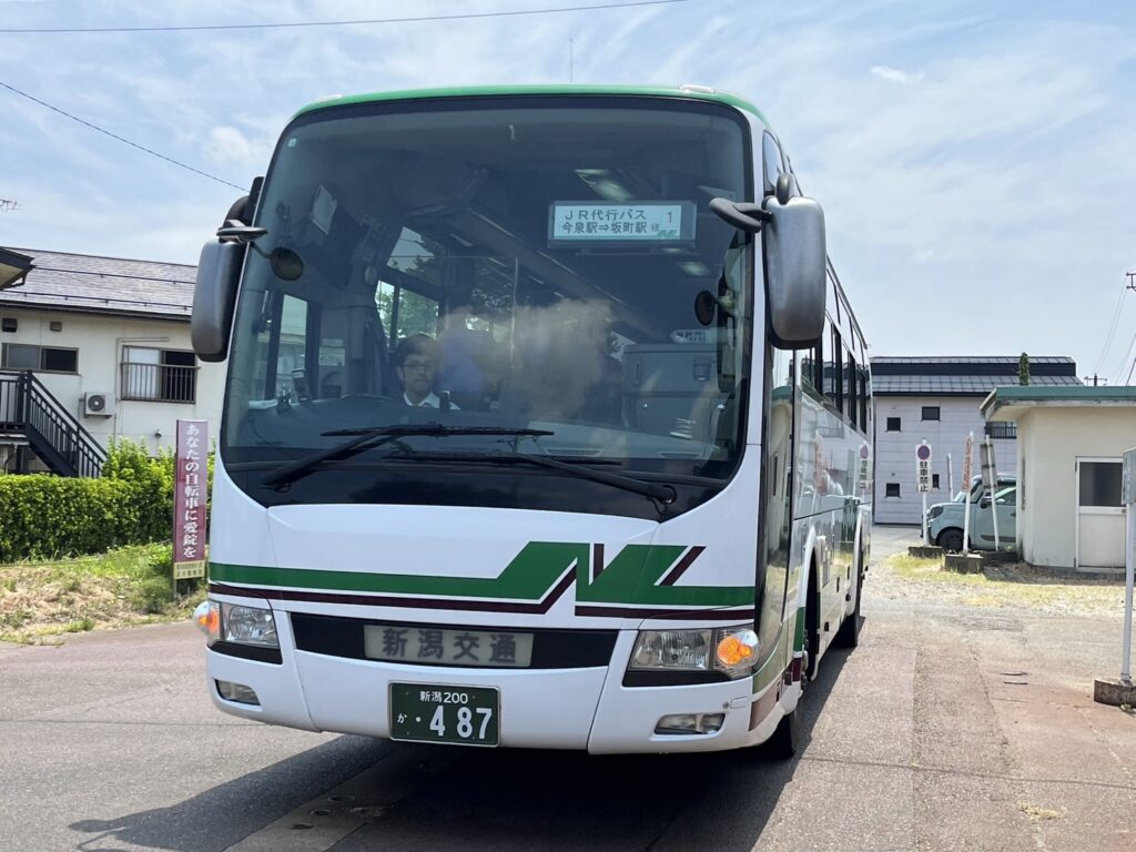 今泉駅から仙台支社から新潟支社に代わり、バスで山越えに挑みます。米坂線と並走する国道113号を走りながら、車内で動画鑑賞及びゲーム、睡眠を楽しんでいるとバスは越後平野に躍り出ます。近くを流れる荒川や住宅街を眺めていると、米坂線復旧を求めた地元住民ののぼり旗がありました。米坂線は過去にも幾度か豪雨で被害を受けているため、今回も以前と同じように復旧してほしいですね。坂町駅からは日本海側を走る重要路線である羽越本線に乗ります。