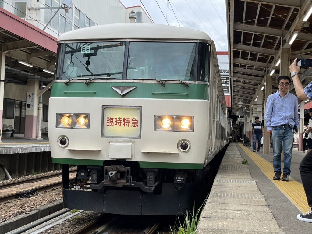 乗車する185系は国鉄時代から運行を始めた特急形電車で、前の顔には国鉄特急の特徴である、「特急シンボルマーク」がつけられています。653系1100番台による上沼垂色編成や、つい最近定期特急やくもから引退した381系にもつけられていますね。ちなみに私は381系が好きで、最近Nゲージで381系やくもを3編成買ってしまいました。話を戻すとこの185系は残るC1編成とB6編成の内B6の方らしいです。地味に3時間以上にもなる耐久乗車ですが、普段から普通列車で各幹線路線を普通列車で駆け回っている鉄研部員には楽勝だね!