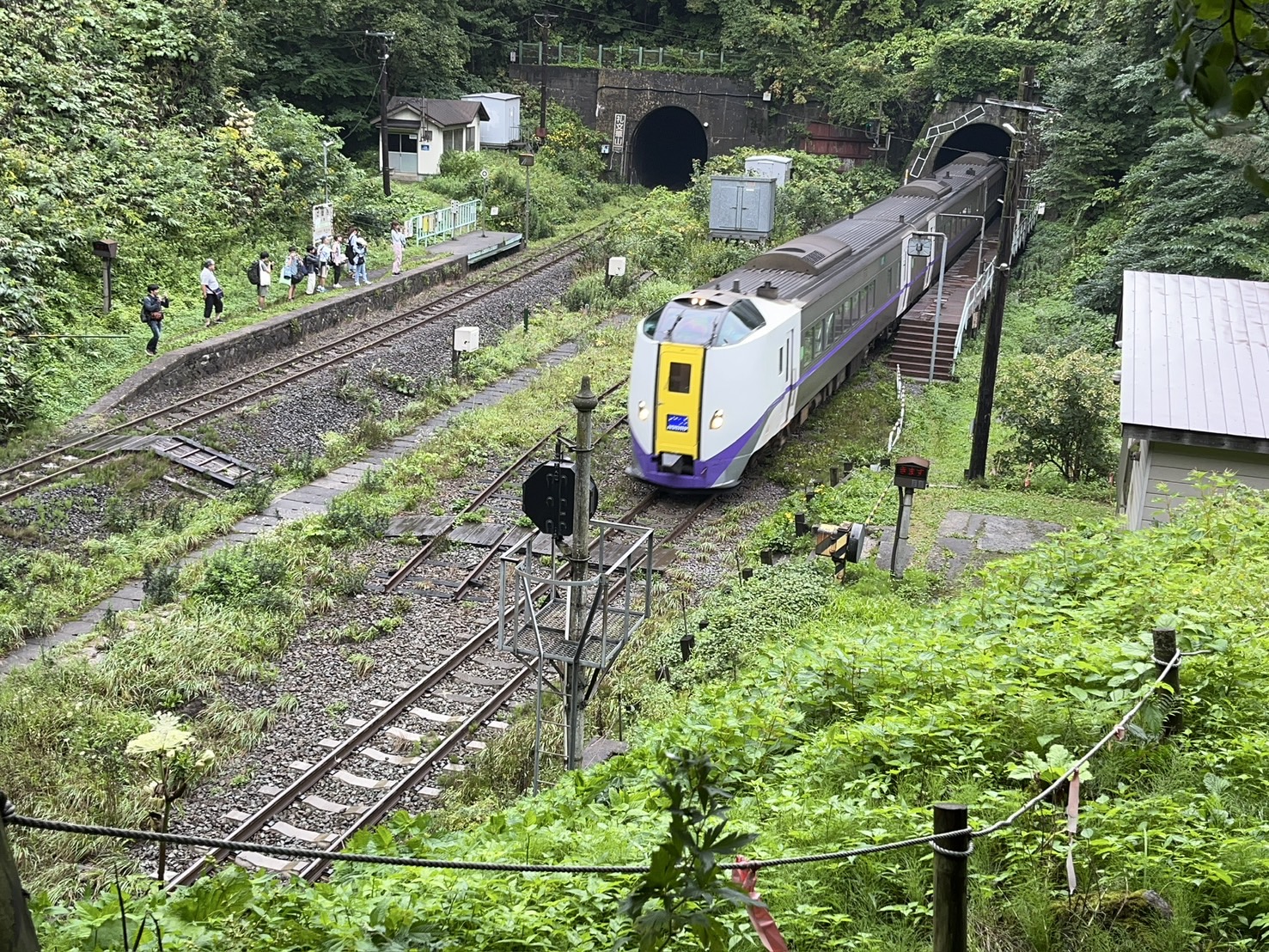 まともに観光するところがないので駅舎の中にあった自転車で遊んで時間をつぶし、やっときた列車で長万部へ向かいます。途中内浦湾を望みながら長万部で特急に乗り換え、洞爺に向かいます。洞爺では観光の時間があったので、部員は全員洞爺湖に行くバスに乗り、洞爺湖に向かいました。洞爺湖では北海道が誇る某コンビニエンスストアで昼食をし洞爺駅に戻ります。危うく数人がタクシーを使ったため乗り遅れそうになっていましたが何とか間に合い、小幌に向かう普通列車に乗ります。地球にやさしいハイブリッドカーに揺られ、小幌に着きました。最も小幌駅に訪れやすい時間ということもありたくさんの人がいました。滞在中には回送列車や特急、貨物といった様々な車両が通るたびに、こんな秘境駅があるものの、北海道の中では重要な幹線路線であることを実感させられました。
