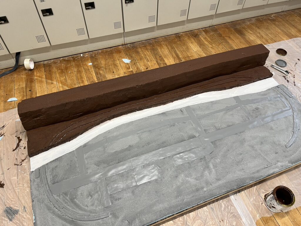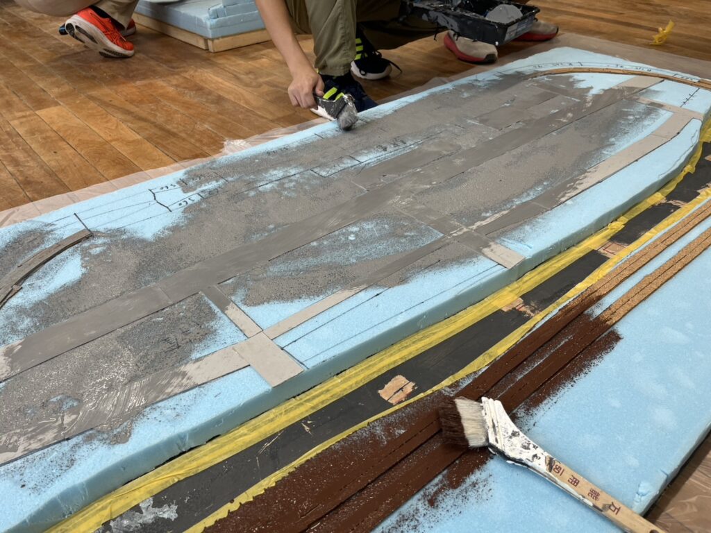 ペンキで塗装します。街側はコンクリートをイメージした灰色、山側は土をイメージした茶色で塗ります。刷毛を使い塗ります。この作業をするためには服を犠牲にしなければならないようです。良い教訓を得ました。作業が遅い作業班長は今年中にこの作業を終わらせることを目標としているらしいです。